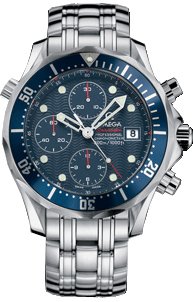 Stainless steel case with a stainless steel link bracelet. Blue aluminum unidirectional rotating bezel. Blue wave dial with luminous hands and luminous dot hour markers. Minute markers around the outer rim. Date displays at the 3 o'clock position. Chronograph - three sub-dials displaying: 60 seconds, 30 minutes and 12 hours. Automatic- chronometer movement. Scratch resistant sapphire crystal. Screw in crown. Solid case back. Helium escape valve. Case diameter: 42 mm. Case thickness: 16 mm. Fold over clasp with push button. Water resistant at 300 meters / 1000 feet. Functions: hours/ minutes/ seconds/ date/ chronograph. Omega seamaster james bond mens watch 2225.80.